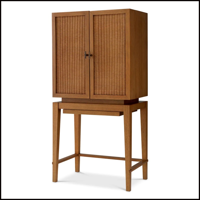 en chêne caramel et ses élégants panneaux en rotin tressé.