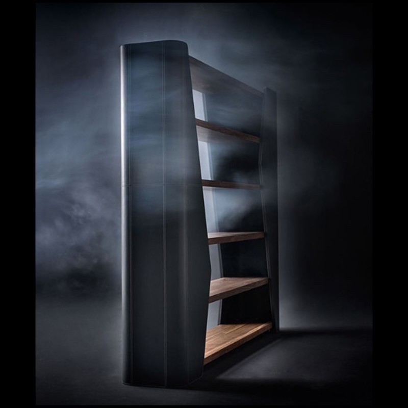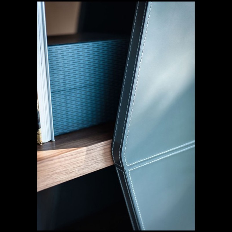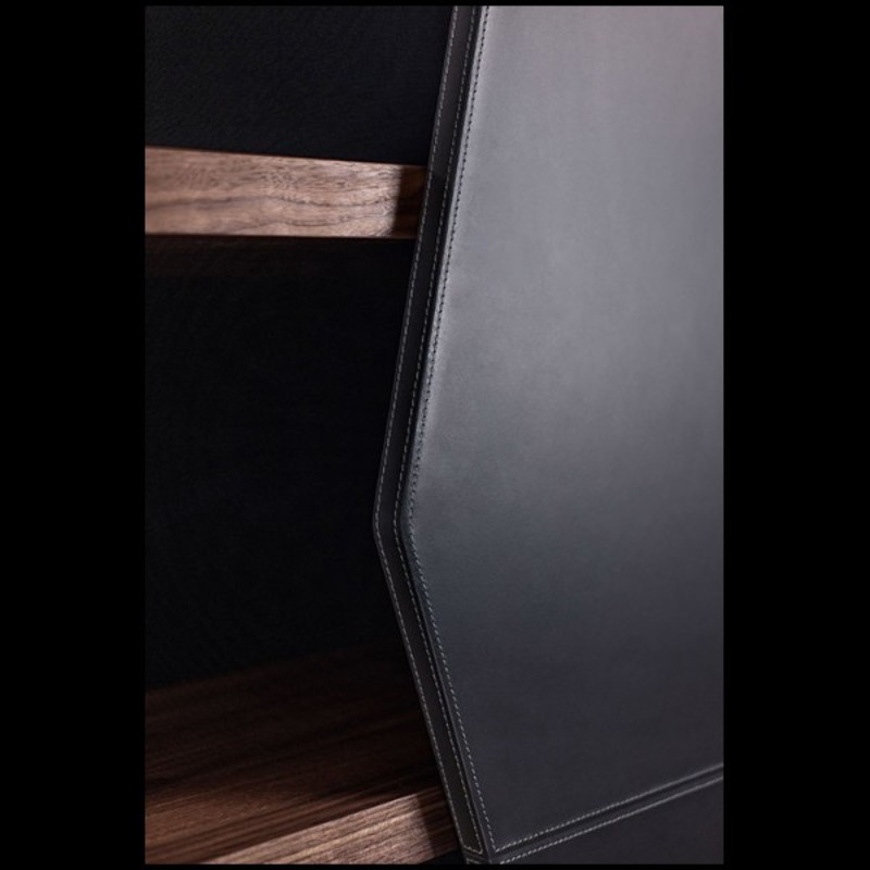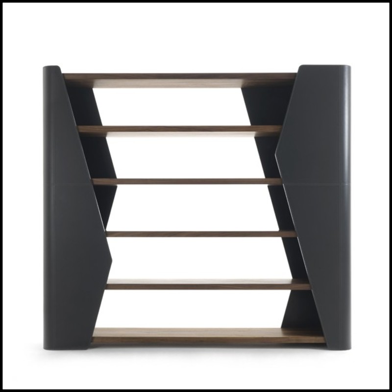 Bibliothèque en bois de noyer massif avec structure asymétrique recouverte de cuir véritable 154-Racing
