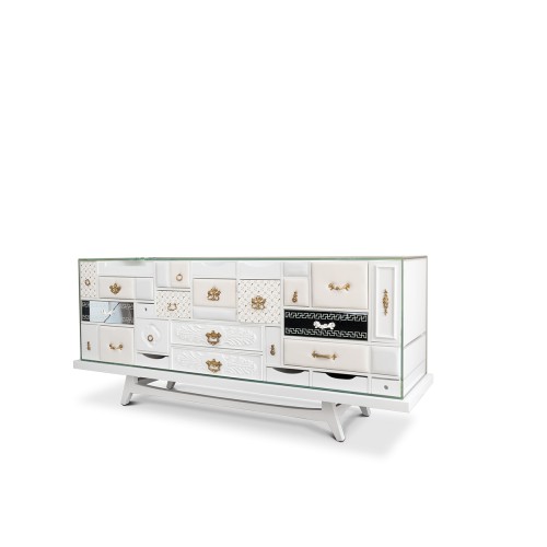 Le Buffet Mondrian est une création signée Boca Do Lobo, parfaite pour un salon ou un hall d'entrée, avec ses dimensions imposantes de 186 cm de largeur, 53 cm de profondeur et 81 cm de hauteur, réalisée en bois, verre, tissu et laiton, offrant ainsi une combinaison parfaite de matériaux pour un effet visuel exceptionnel.
