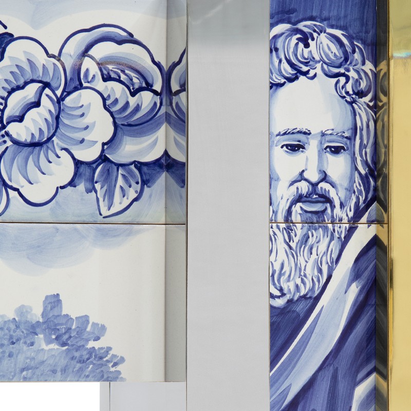 Matière : Hand painted tiles, wood, polished brass, beveled mirror