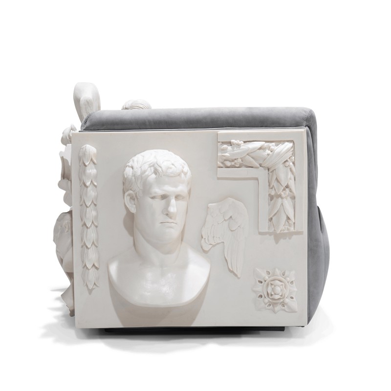 Matière : structure en bois, panneaux en résine sculptés à la main, velours et coussins amovibles, pieds en acrylique