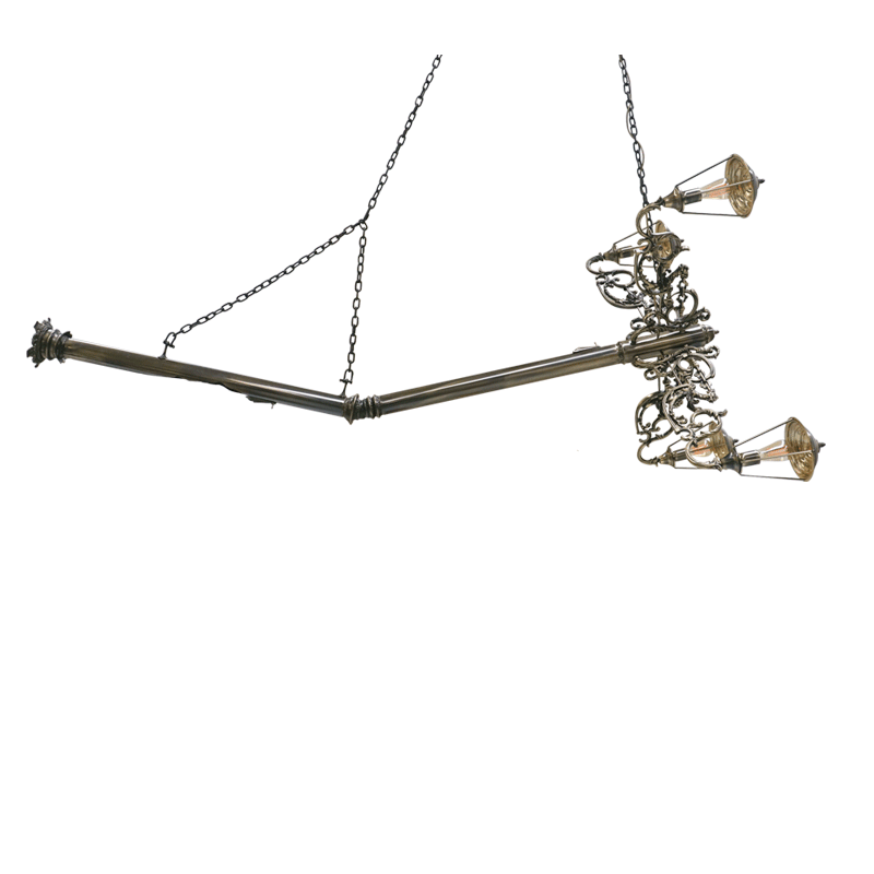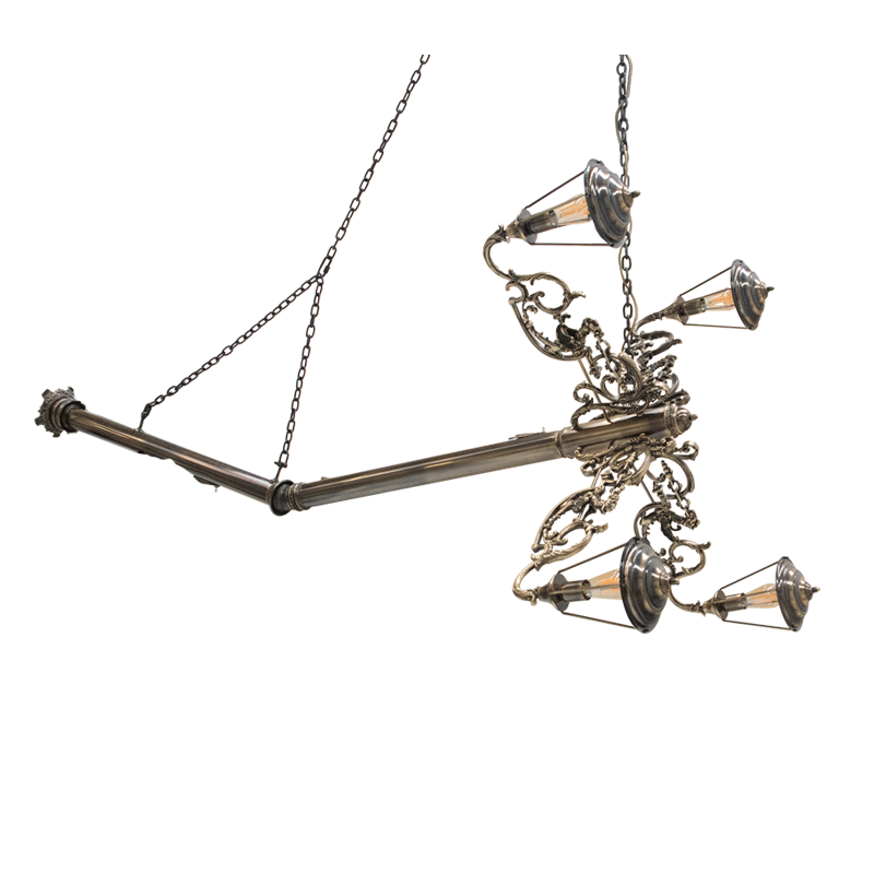 Matière : lampe en laiton, cinq points lumineux et deux interrupteurs, fabriquée avec moules de fonderie, finition patinée