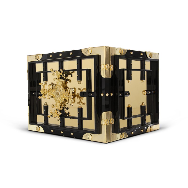 Le Remontoir de montre Knox est une création signée Boca Do Lobo pour un usage raffiné dans un salon ou un hall d'entrée, avec une dimension imposante de L 73 CM | P 65 CM | H 55 CM et une couleur or qui reflète la richesse du Fort Knox, symbole de sécurité et de réserve d'or.