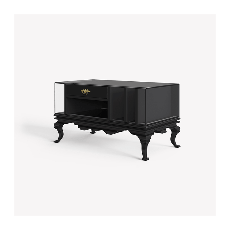 Matière : bois laqué noir, verre fumé, vernis mat et brillant, poignée en laiton plaqué or