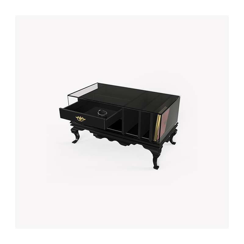 bois laqué noir, verre fumé, vernis mat et brillant, poignée en laiton plaqué or