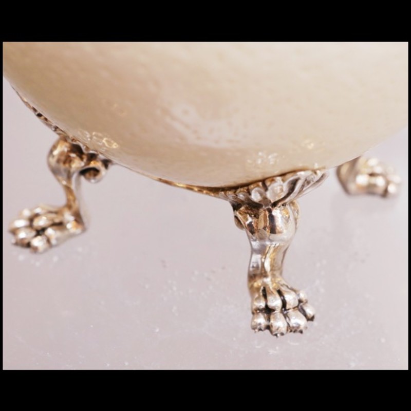 Véritable œuf d'autruche avec couvercle et pieds en métal argenté.