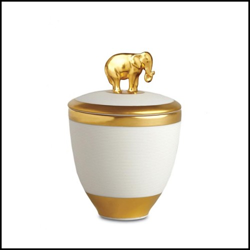 Boîte à bougie en porcelaine finition blanche et plaquée or 24 Karats avec elephant sur le couvercle 172-Elephant White