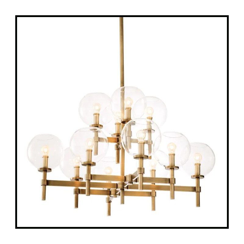 Ce luminaire à deux niveaux a une finition en laiton antique.