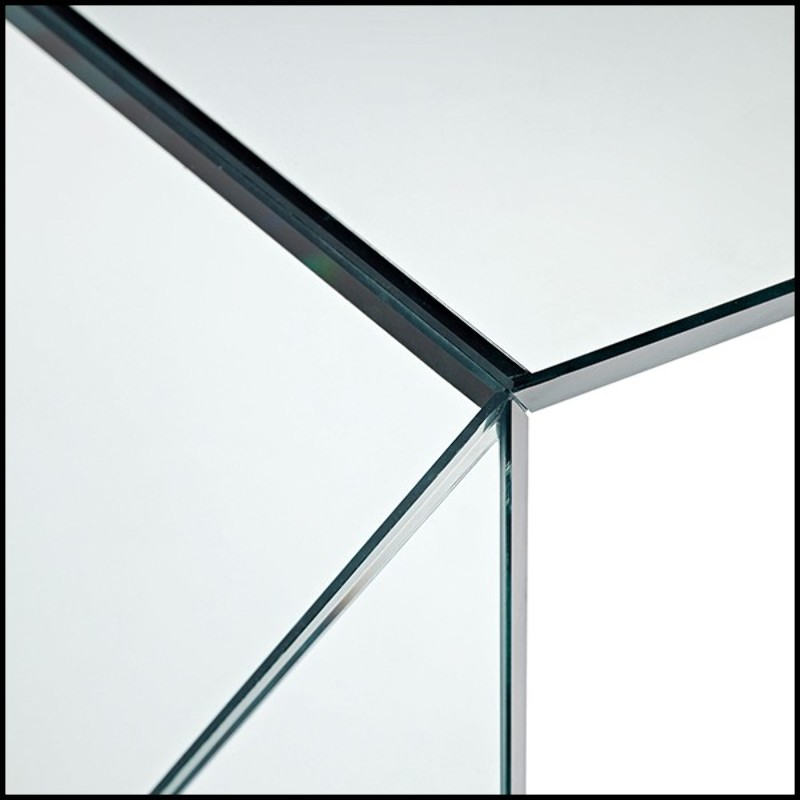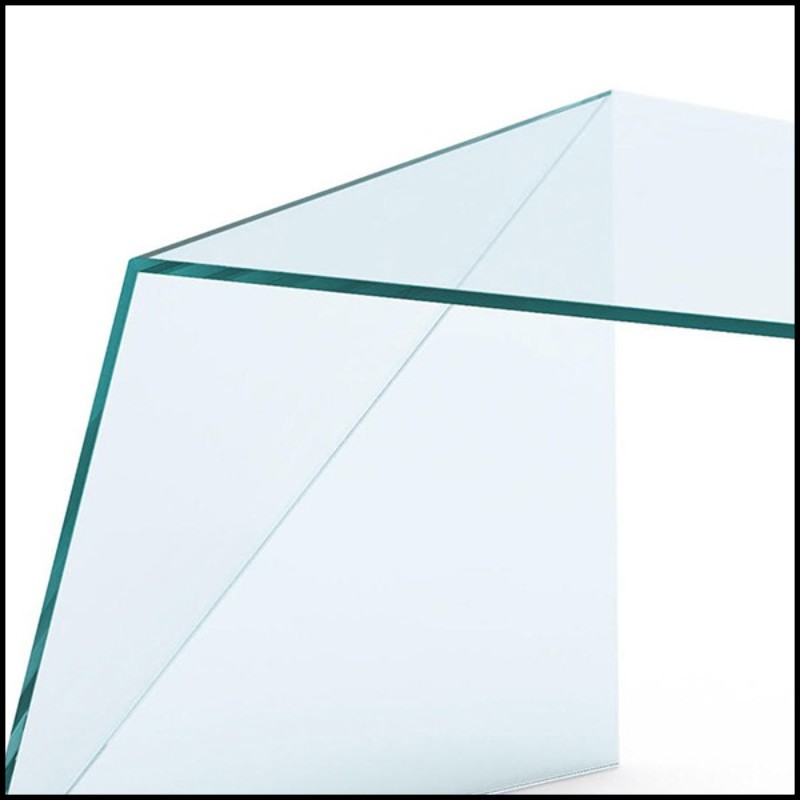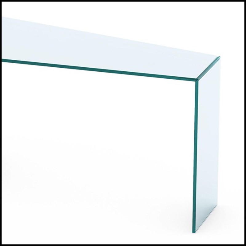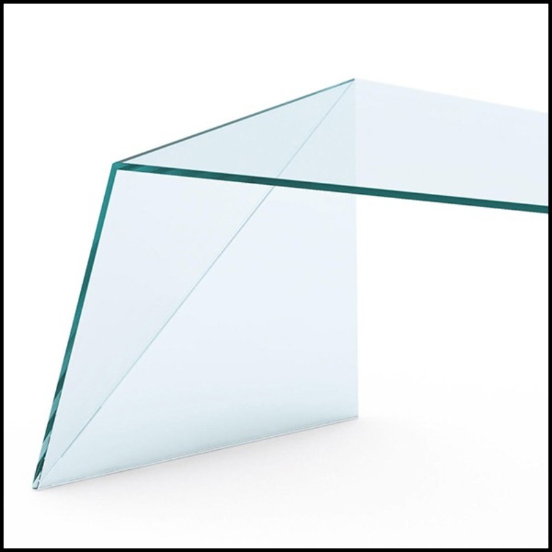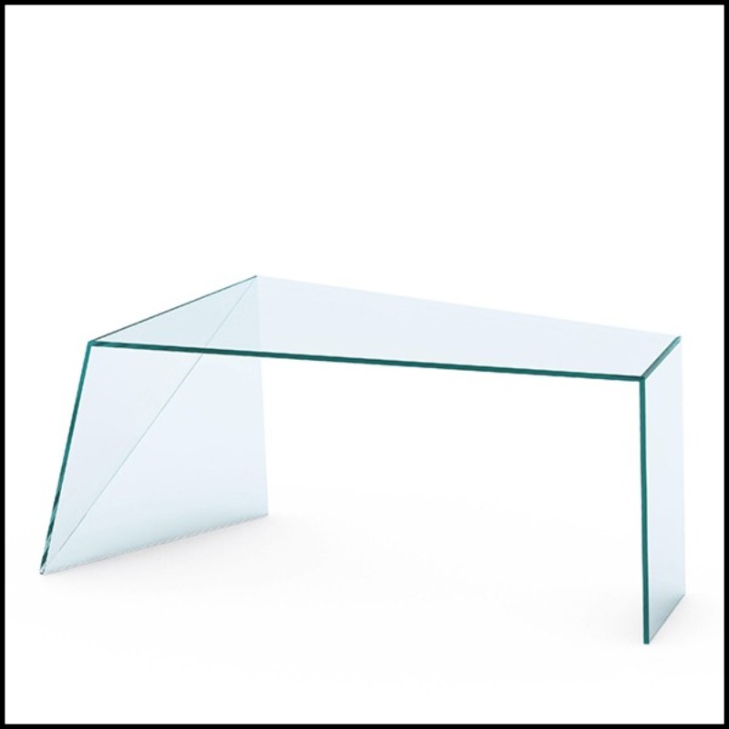 Desk Axis tout en verre clair avec un forme asymétrique.