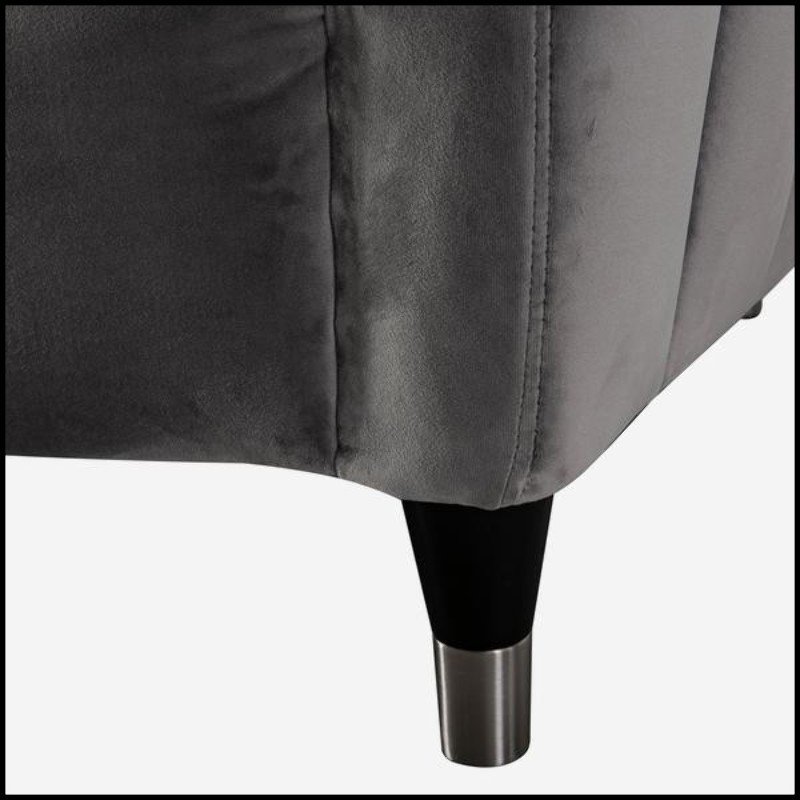 Chaise rembourrée de velours gris clair avec surpiqûres décoratives.