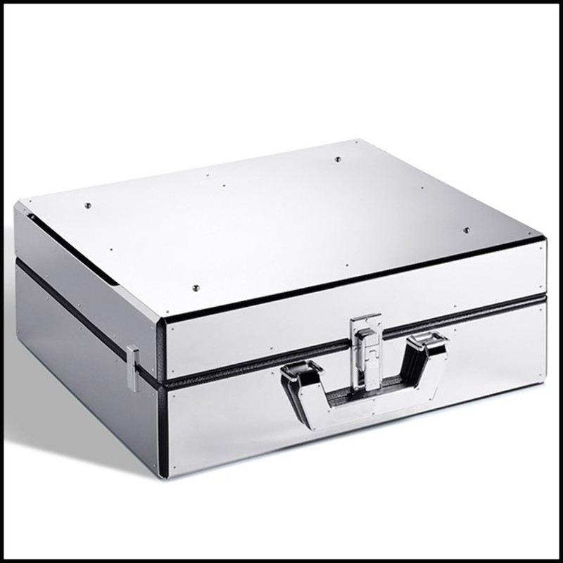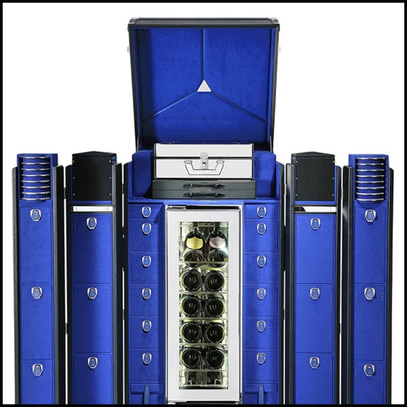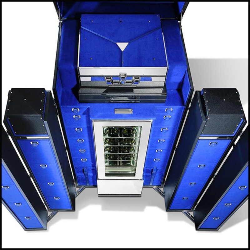 La malle comprend 16 sous-verres en cuir marine blanc et cuir de vachette grainé noir.