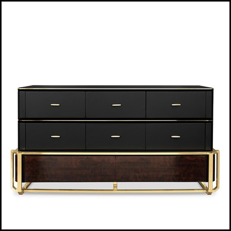 Côtés ainsi que les 6 tiroirs recouverts de cuir noir.