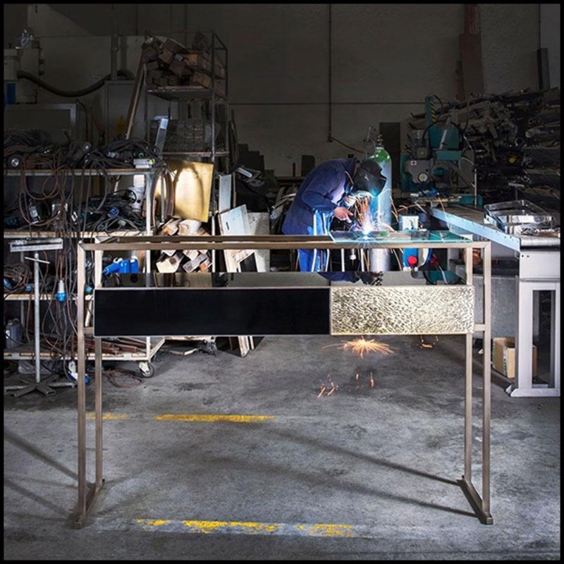 Console Pietro avec une structure en métal finition laiton bruni et vieilli.