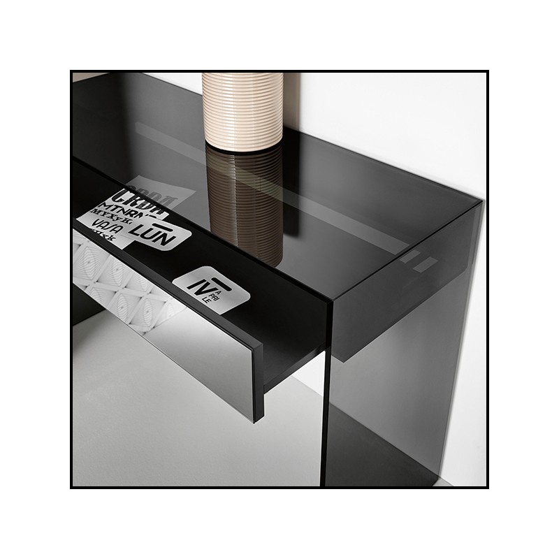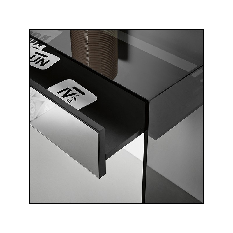 Structure du tiroir en bois noir avec façade en verre fumé.