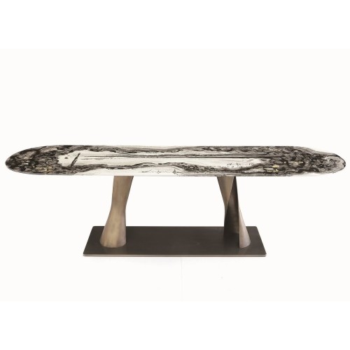 Sa structure à finition bronze patiné, surmontée d’un plateau en verre clair