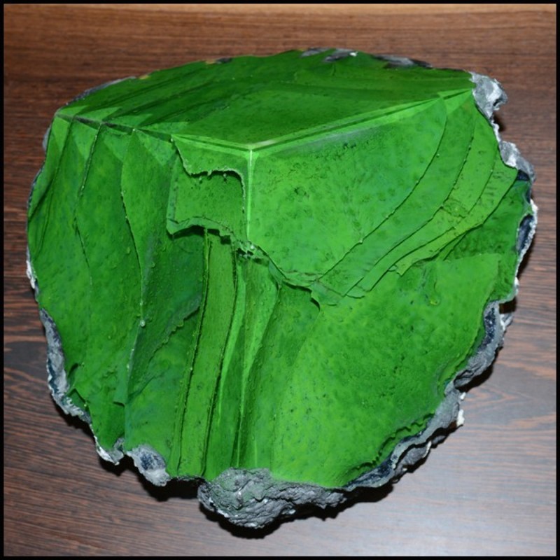 Sculpture avec lanières en pâte de verre coloré avec pigments verts coulé sur base en pierre brute PC-Glass Alchemy Green