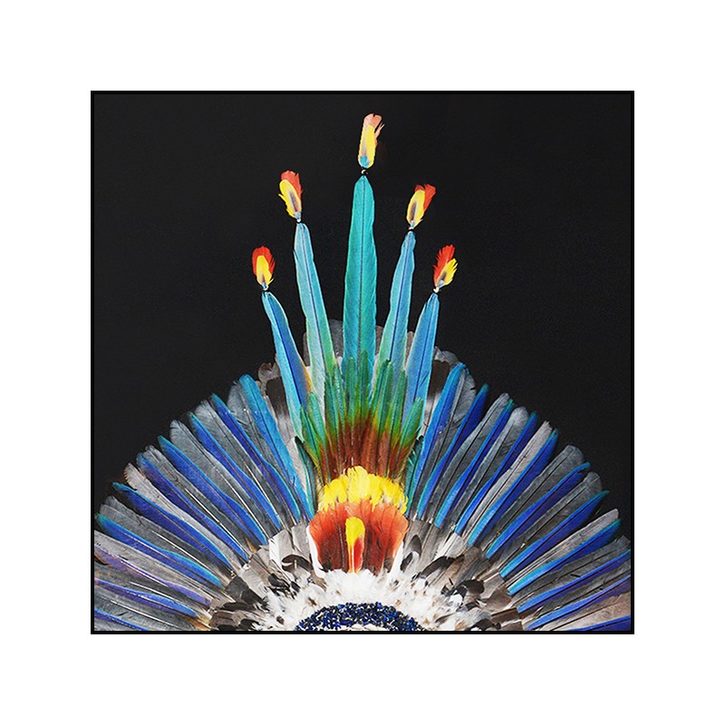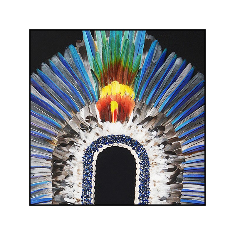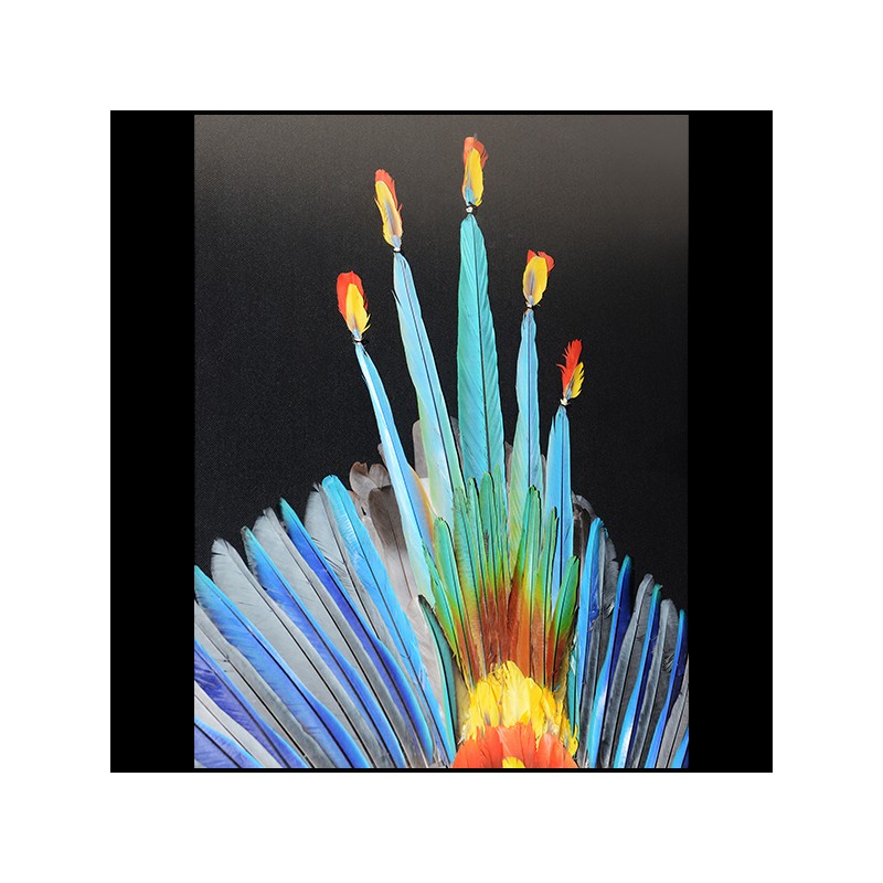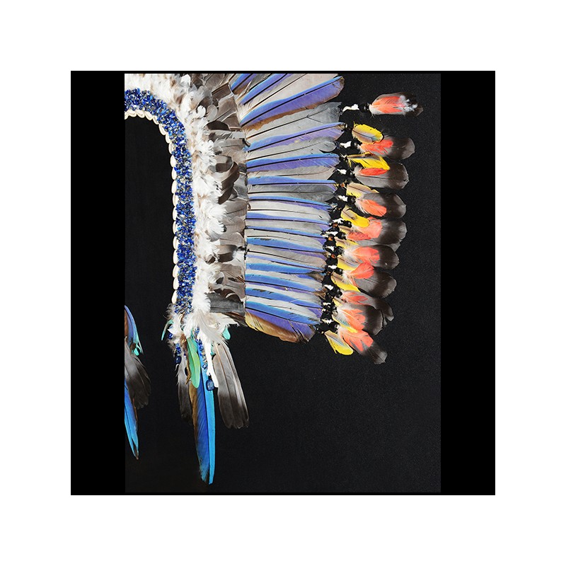 Coiffe , sous vitrine en verre, composé de plumes d'ara bleu, et autres plumes d'oiseaux sud-américains.