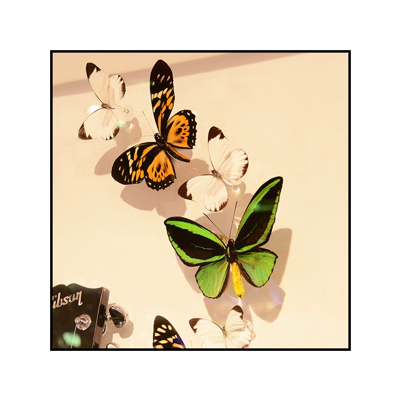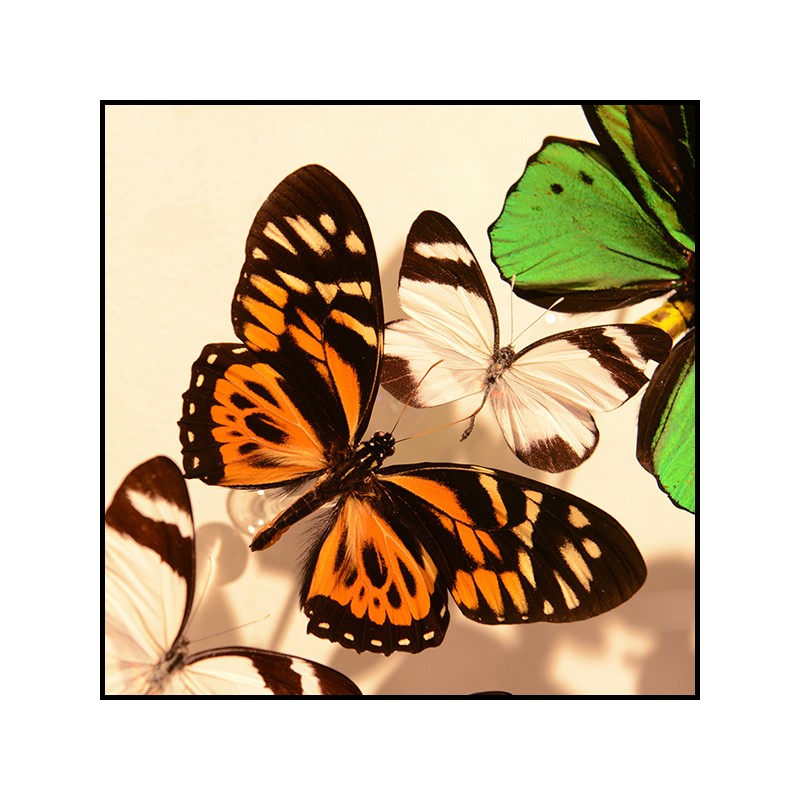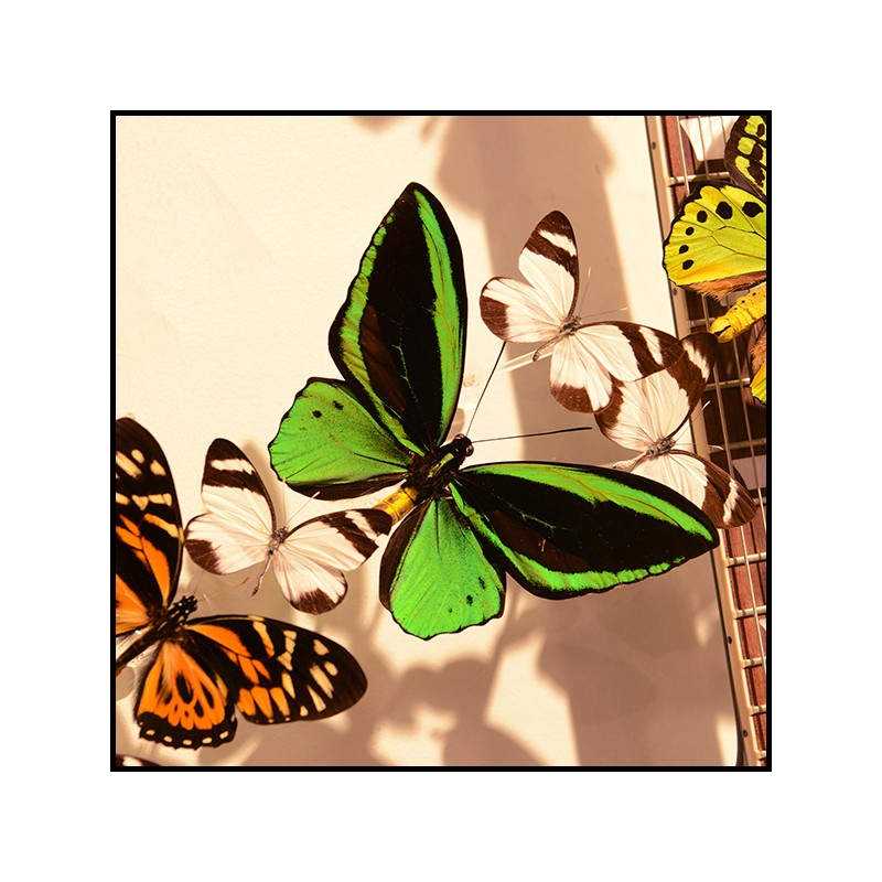 mise en scène avec de vrais papillons provenant de fermes d'élevage.