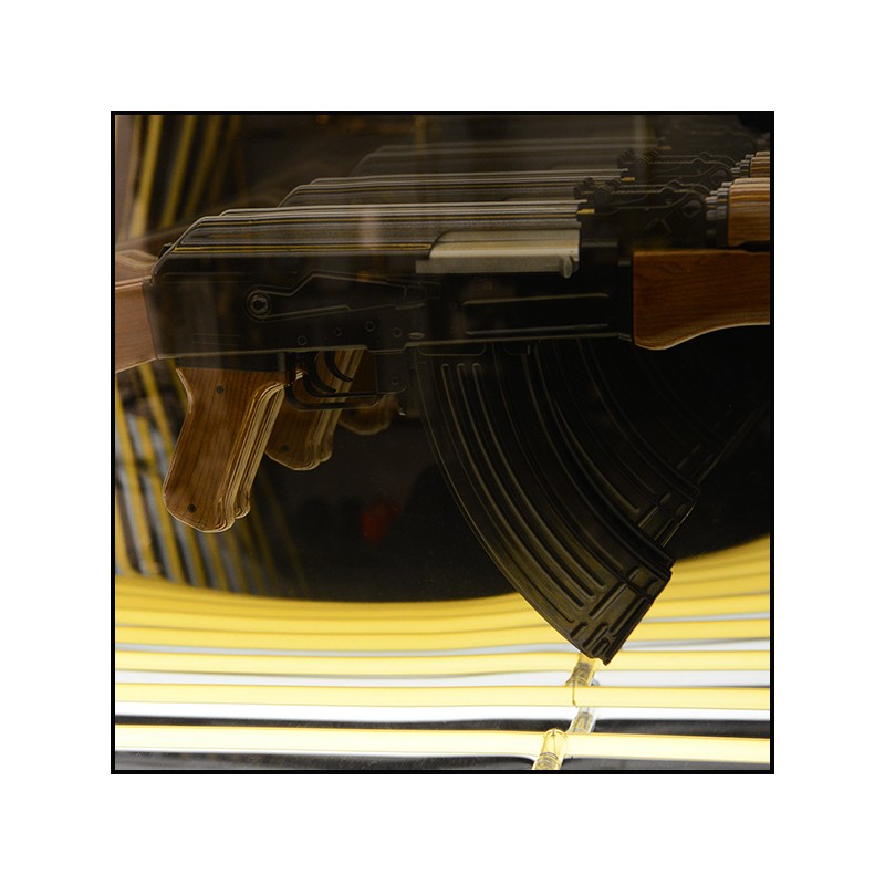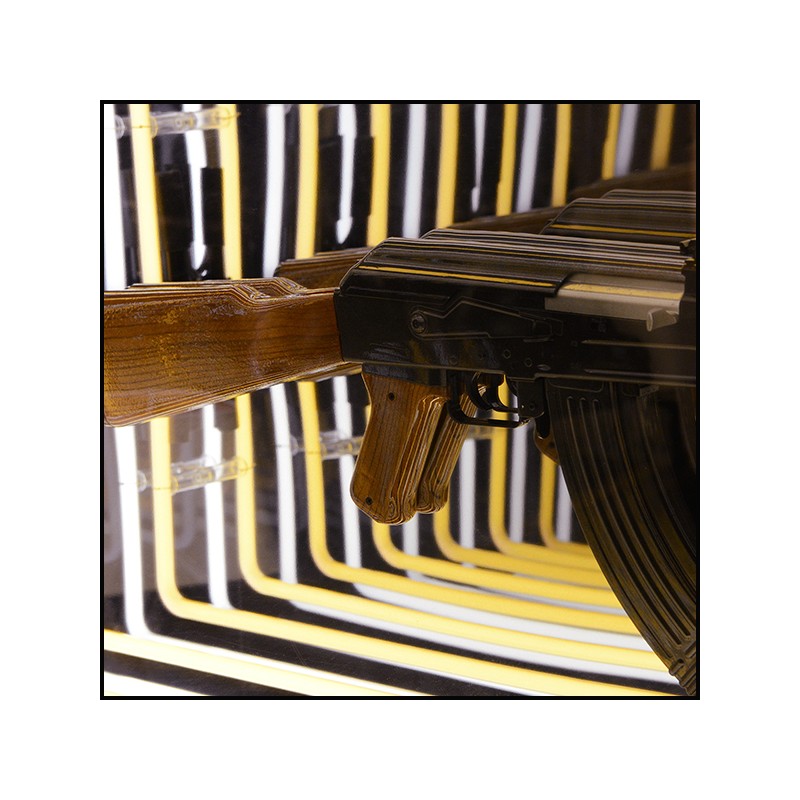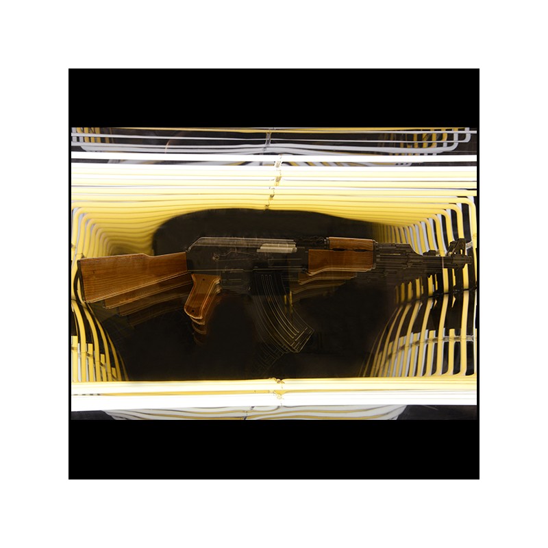 Réplique de démonstration d'un pistolet en résine, positionné au centre intérieur de la pièce.