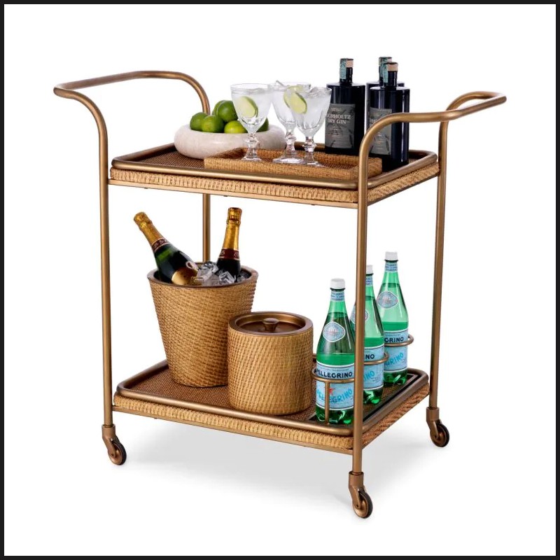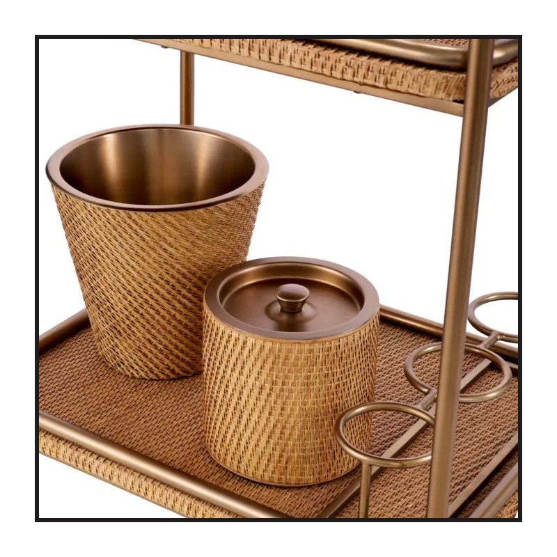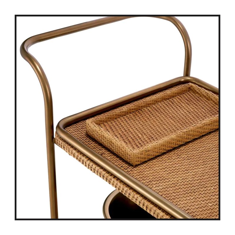 Sa structure en laiton vintage sublime ses plateaux en rotin naturel,