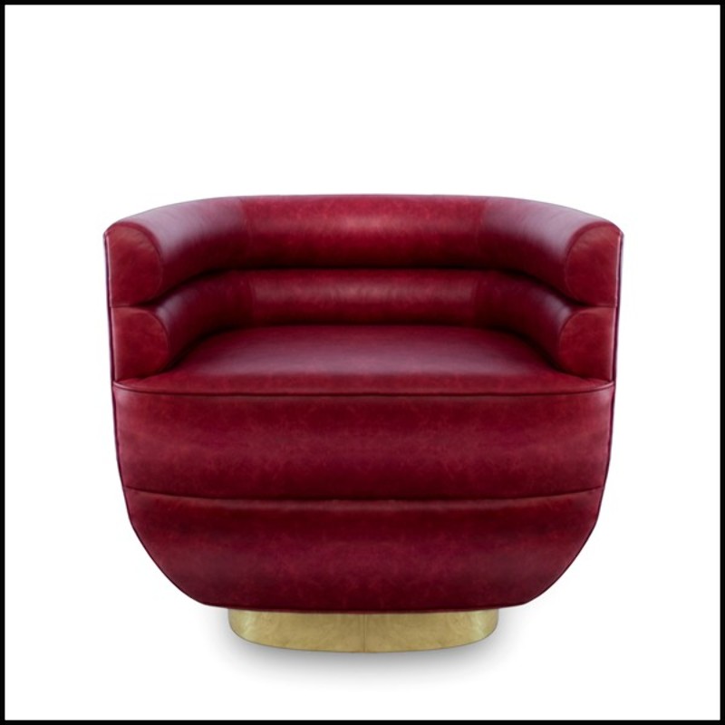 Ce fauteuil rouge est caractérisé par un délicat revêtement en cuir véritable, ainsi qu’un piètement en laiton poli.