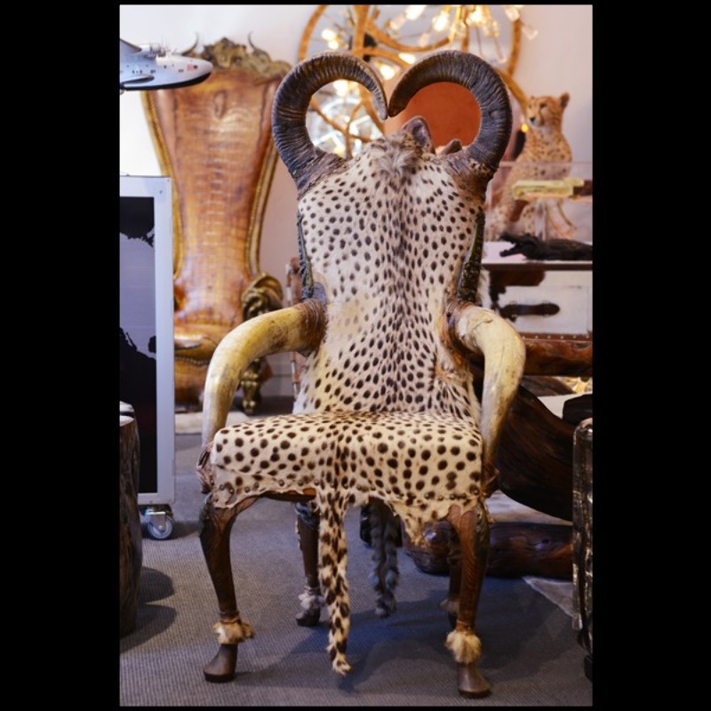 Fauteuil en hêtre massif avec 2 véritables peaux de guépards 2 cornes de Buffle africain et de Buffle d'Asie PC-Cheetah