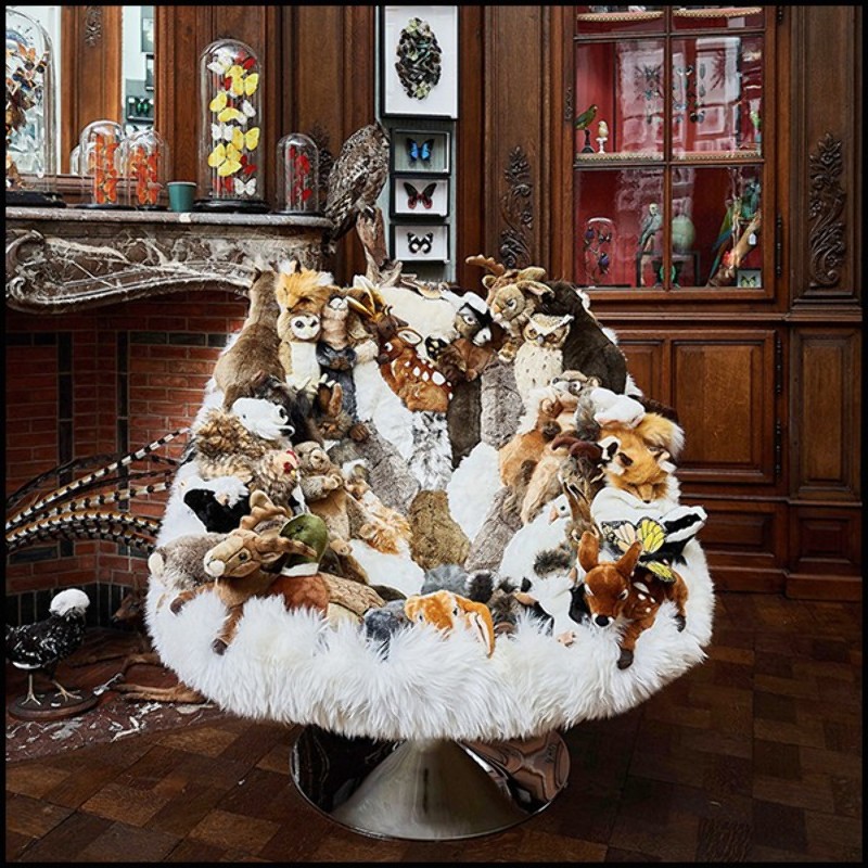 Fauteuil Chamonix, composé de peluches d'animaux alpins minutieusement