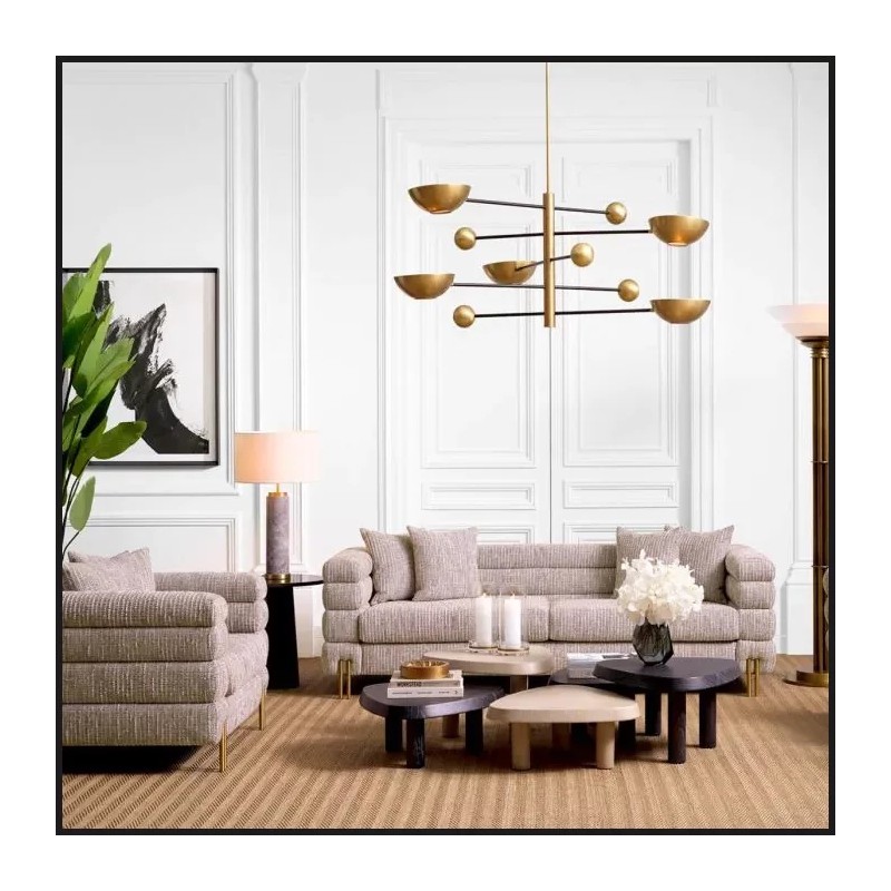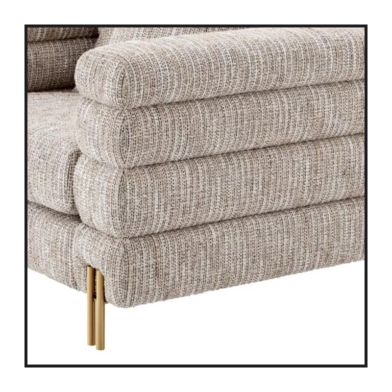 Son revêtement en tissu bouclé crème et ses pieds finition laiton brossé