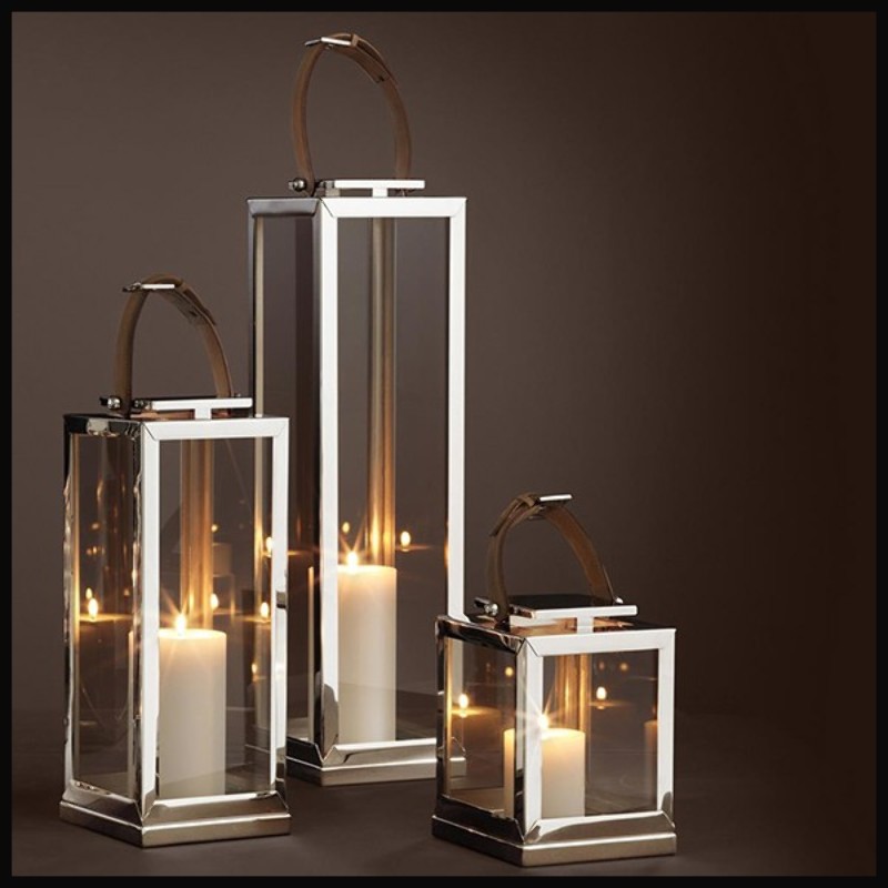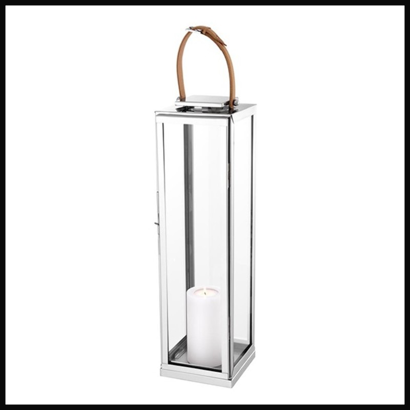 finition nickel, verre clair et anse en cuir de boeuf tané