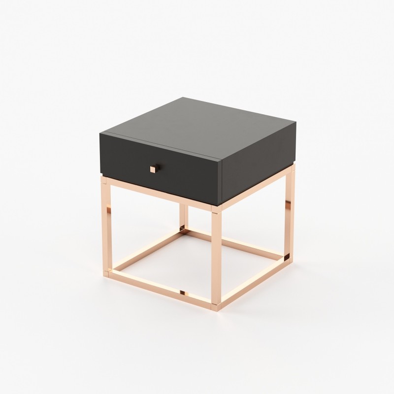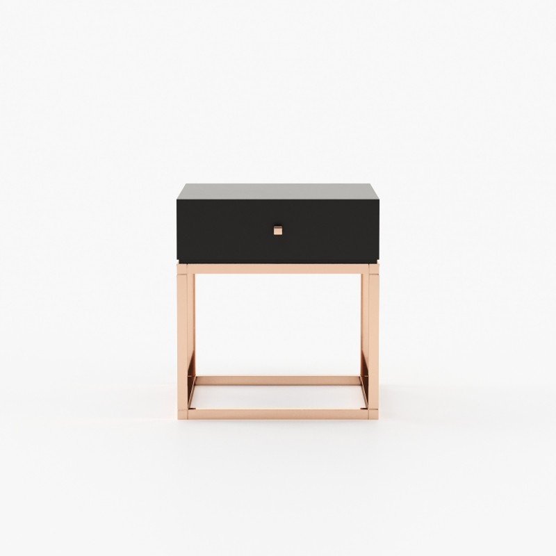 La Table de chevet Ester est une création signée Laskasas conçue pour le salon ou la chambre, caractérisée par sa couleur noyer mat et sa matière en bois et métal.