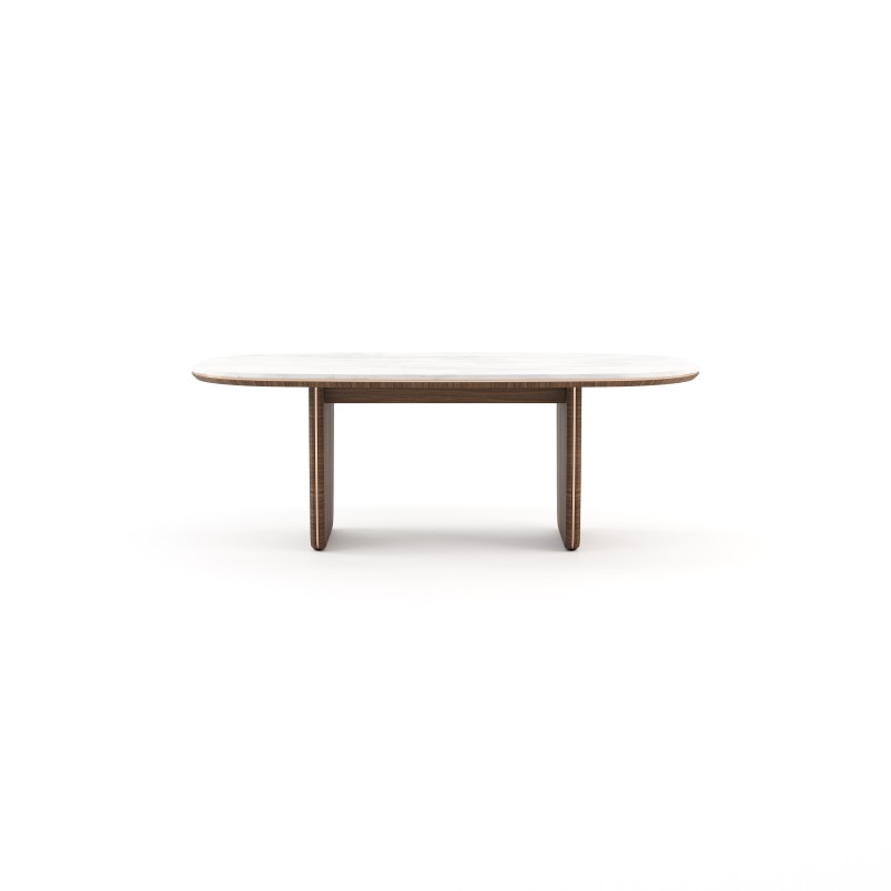La Table à manger Jeane est une création signée Laskasas pour le salon ou la salle à manger, alliant marbre blanc et noir avec une structure en bois et métal, évoquant un style contemporain et luxueux.