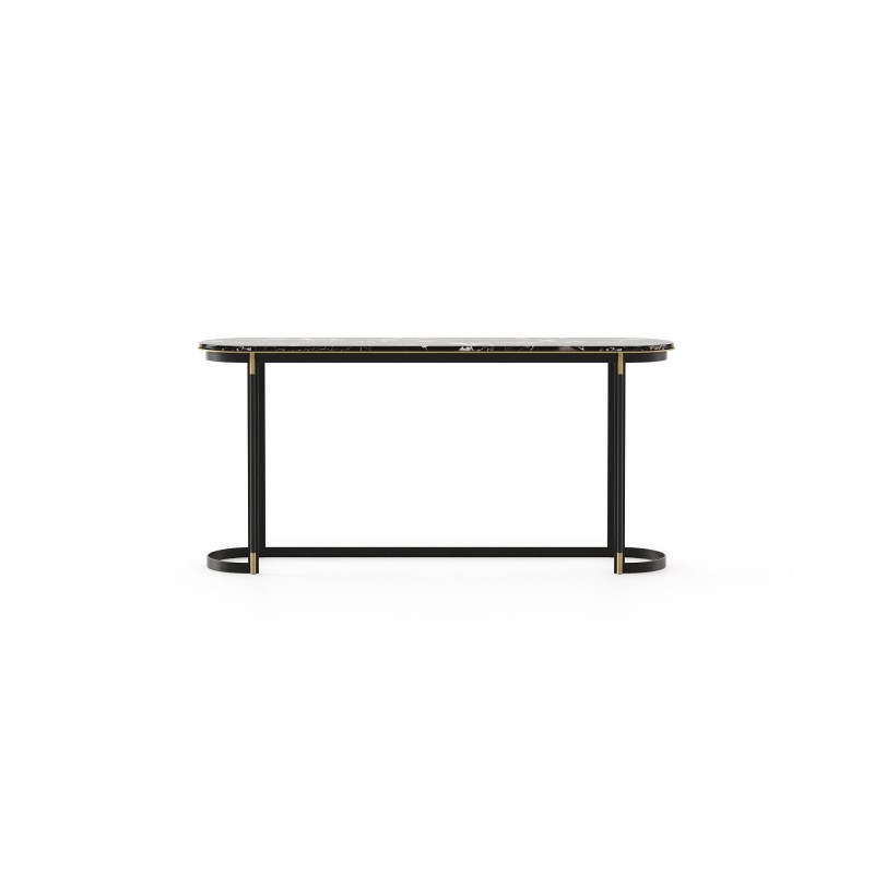 Doté d'une structure métallique solide, ce meuble présente une belle finction bois/marbre qui évoque un sentiment de chauffe et de confort, avec une touche de modernité apportée par le métal.