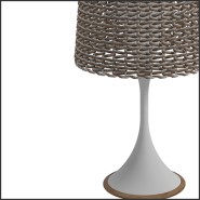 en aluminium raffinée, une base en teck naturel chaleureuse et un abat-jour