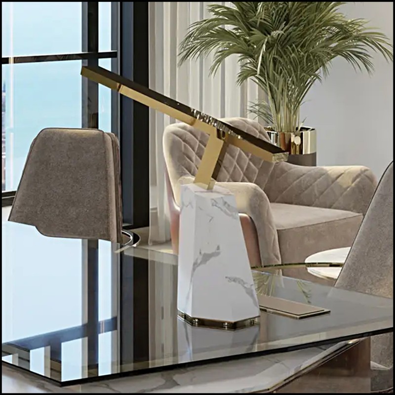 par une base en marbre de Carrare et des cadres diagonaux en laiton,