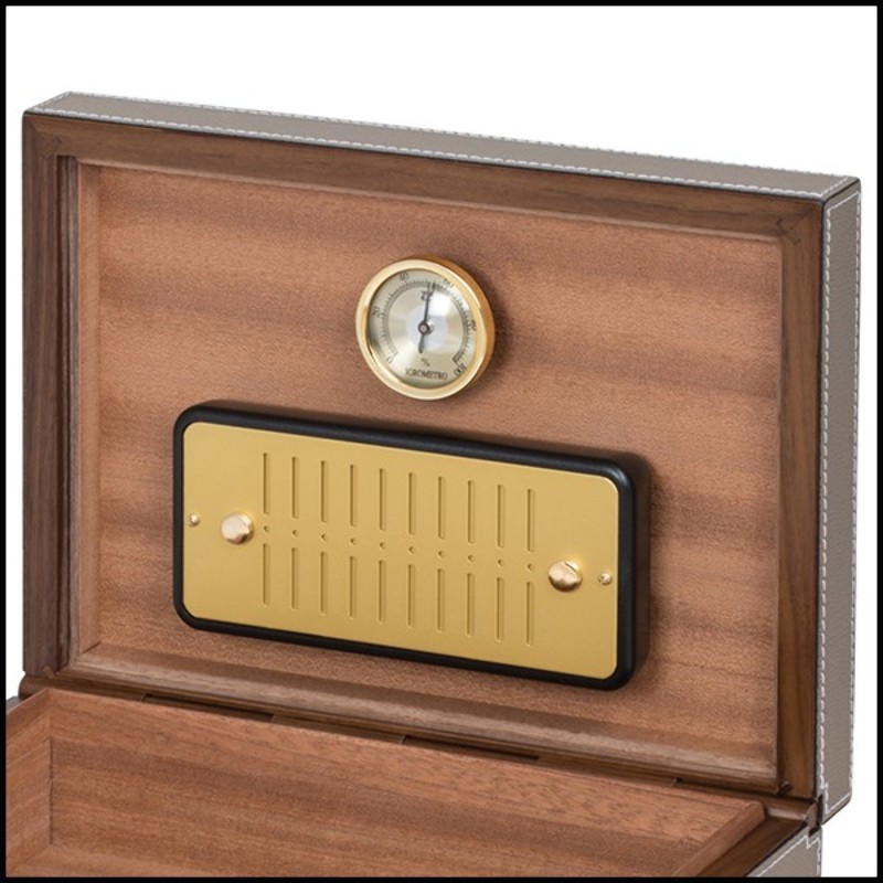 L'intérieur de la boîte comprend un hygromètre et un humidificateur.