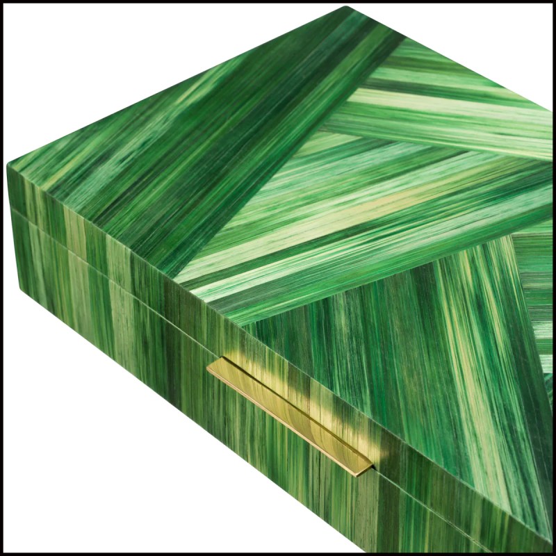 Son élégante marqueterie de paille aux teintes vertes vibrantes.