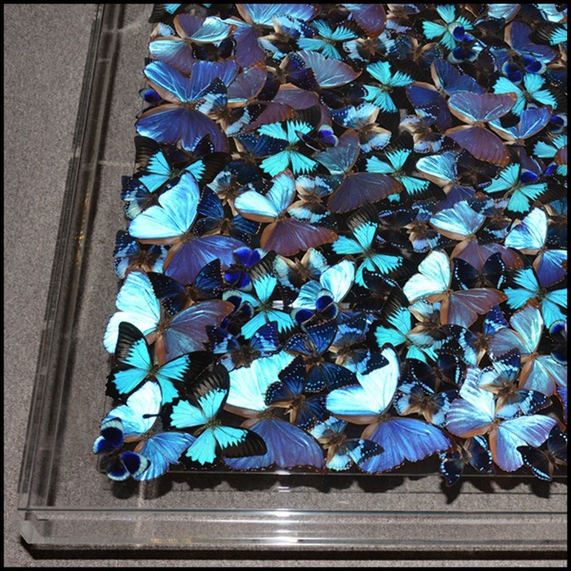 Table basse avec près de 330 papillons sous cadre en plexiglass et plateau en verre PC-Blue Butterflies
