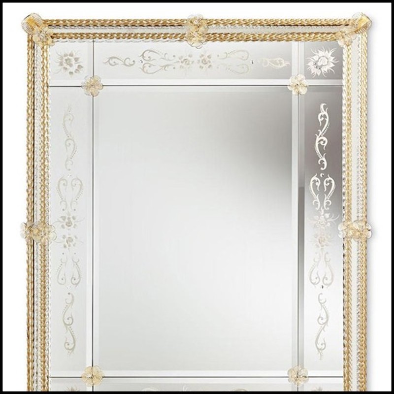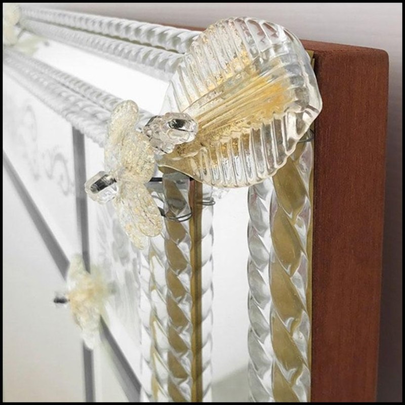 Feuilles décoratives, rosaces et cordes torsadées en cristal et verre de Murano doré.
