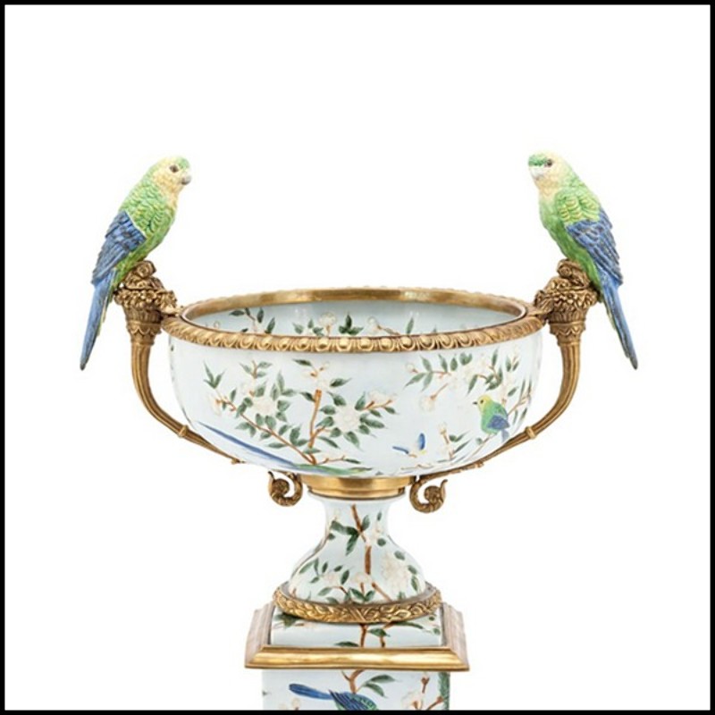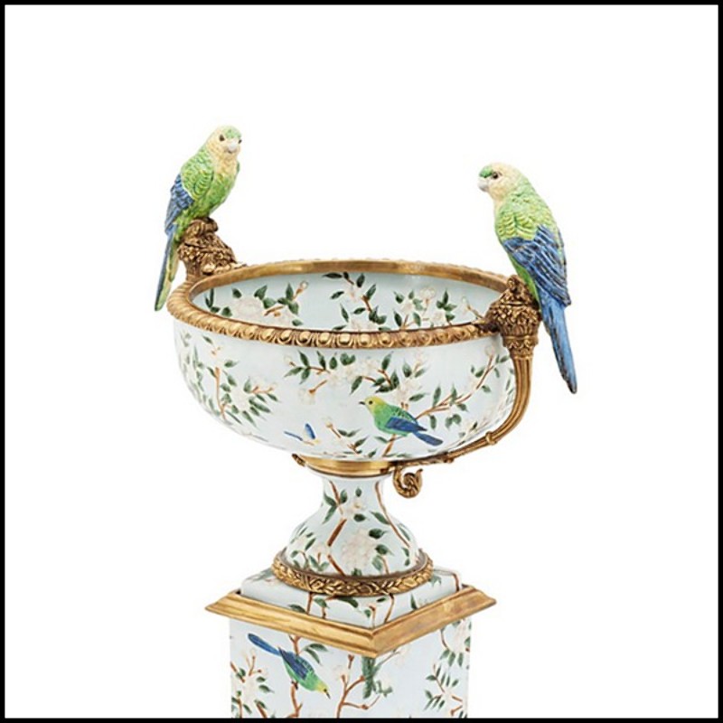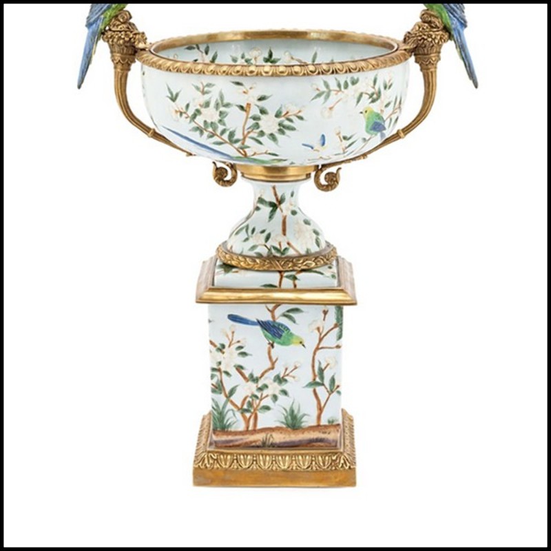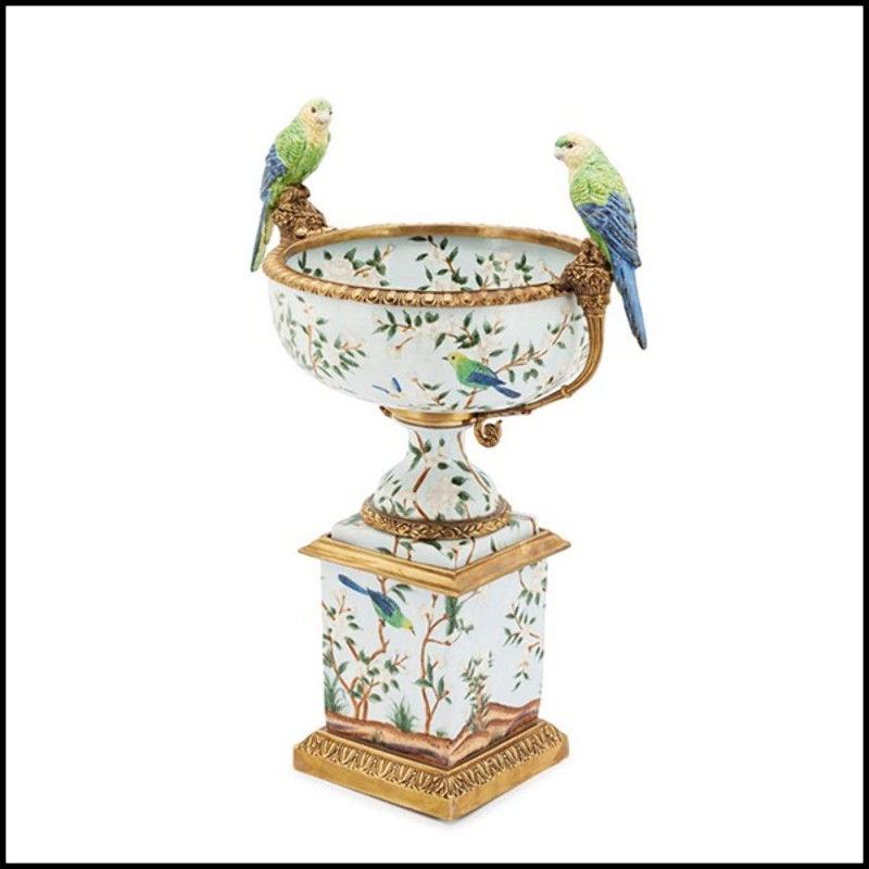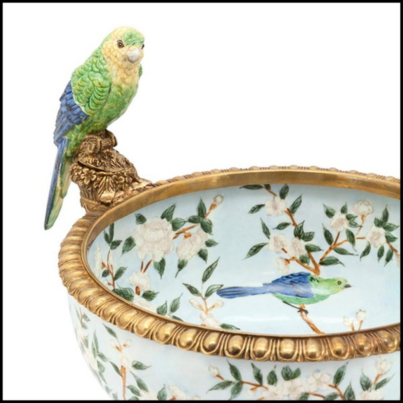Bol en porcelaine peinte à la main avec détails en bronze massif 162-Parrots Flowers