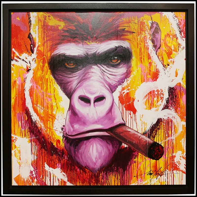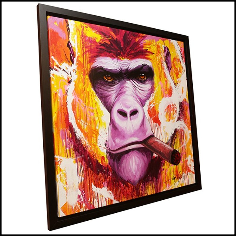 Cette peinture sur toile est une pièce unique. Montée sur un cadre en chêne massif teinté en noir, cette œuvre d'art aux couleurs chaudes contribuera à une atmosphère conviviale et chaleureuse. Parfaitement à un endroit dans un salon ou un séjour, cette peinture décorera votre intérieur avec une touche d'insolence et d'audace. Ce mélange des couleurs réchauffera l'atmosphère de votre pièce et installera une sensation de bien-être. Vos invités se sentent bien chez vous. Difficile d'être de mauvaise humeur dans une telle ambiance. Parties endiablées de poker ou soirée entre amis à refaire le monde, cette toile saura mettre tout le monde à l'aise pour des moments inoubliables.