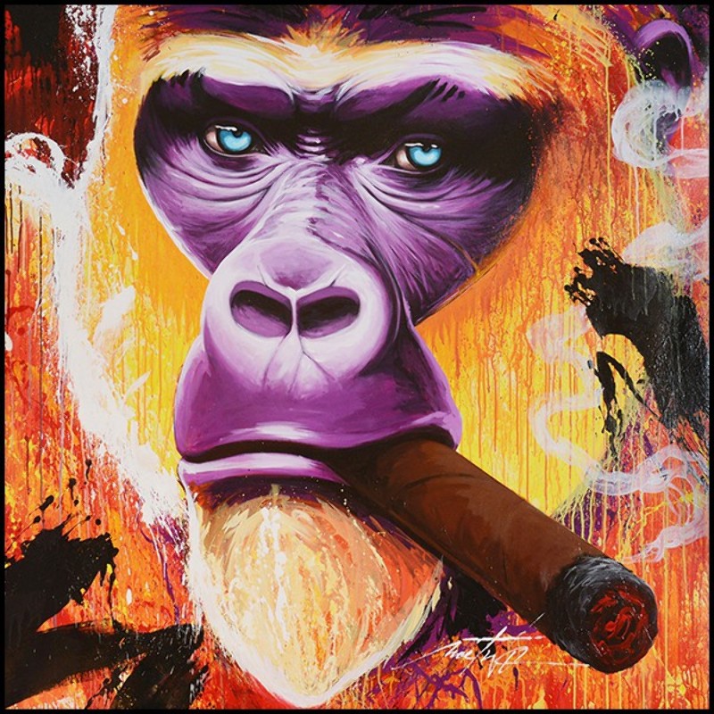 Cette peinture sur toile est une pièce unique. Montée sur un cadre en chêne massif teinté en noir, cette œuvre d'art aux couleurs chaudes contribuera à une atmosphère conviviale et chaleureuse. Parfaitement à un endroit dans un salon ou un séjour, cette peinture décorera votre intérieur avec une touche d'insolence et d'audace. Ce mélange des couleurs réchauffera l'atmosphère de votre pièce et installera une sensation de bien-être. Vos invités se sentent bien chez vous. Difficile d'être de mauvaise humeur dans une telle ambiance. Parties endiablées de poker ou soirée entre amis à refaire le monde, cette toile saura mettre tout le monde à l'aise pour des moments inoubliables.