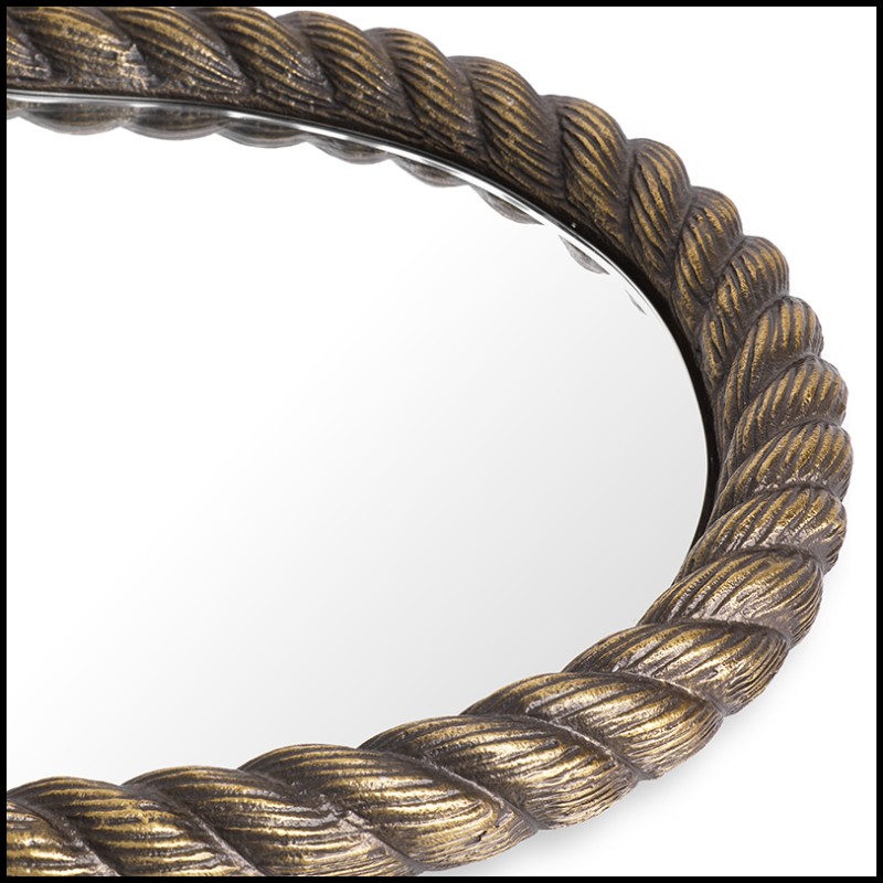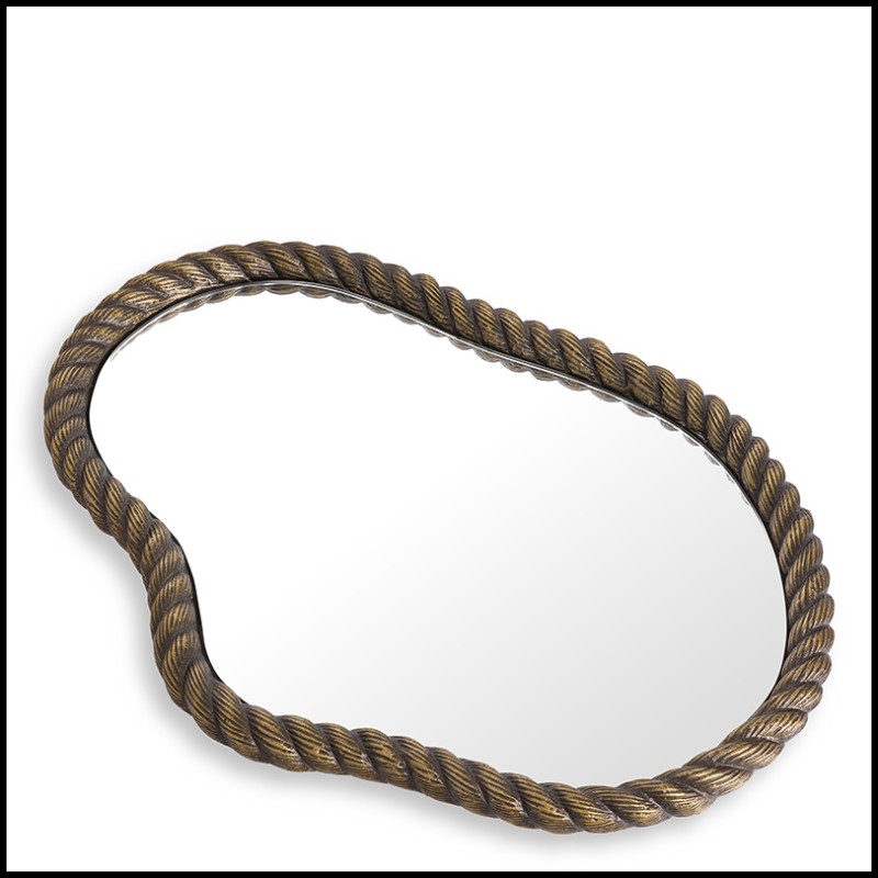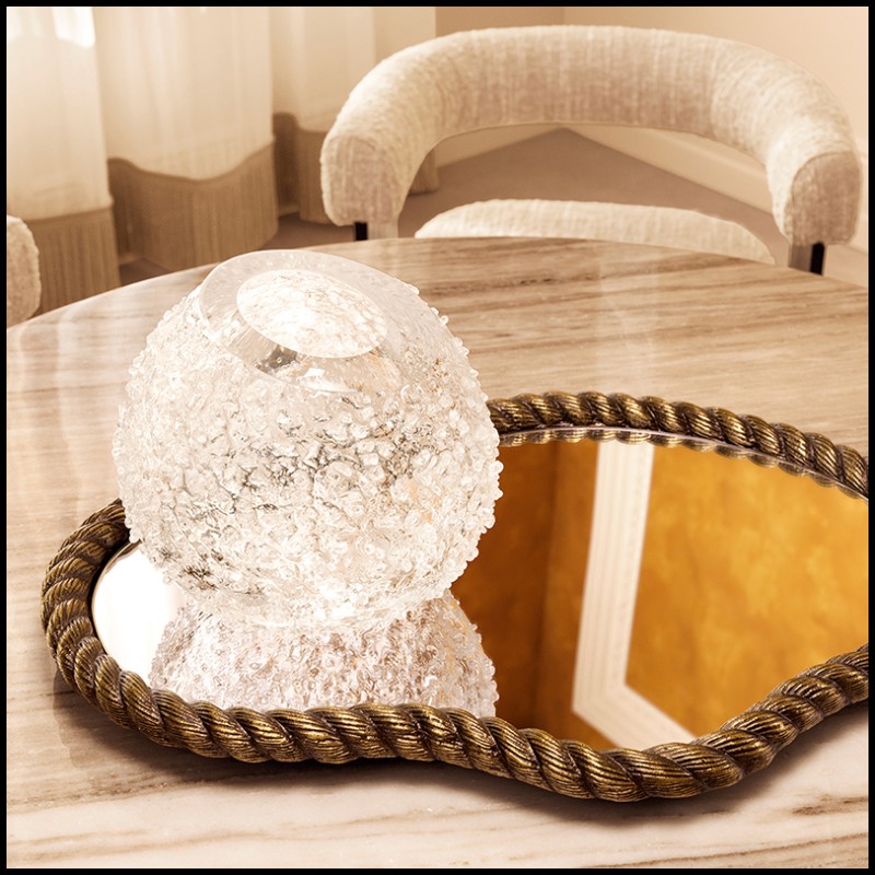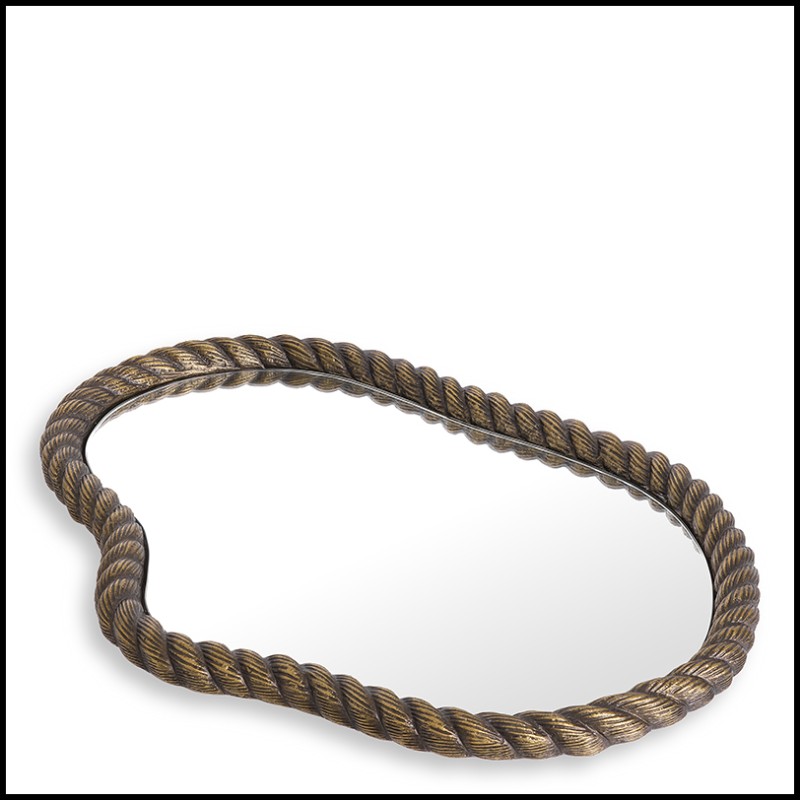 Le plateau est réalisé avec un mélange d'aluminium, de verre miroir et de MDF, offrant une structure solide et un aspect luxueux. La surface en verre miroir donne une sensation de profondeur et de légèreté.