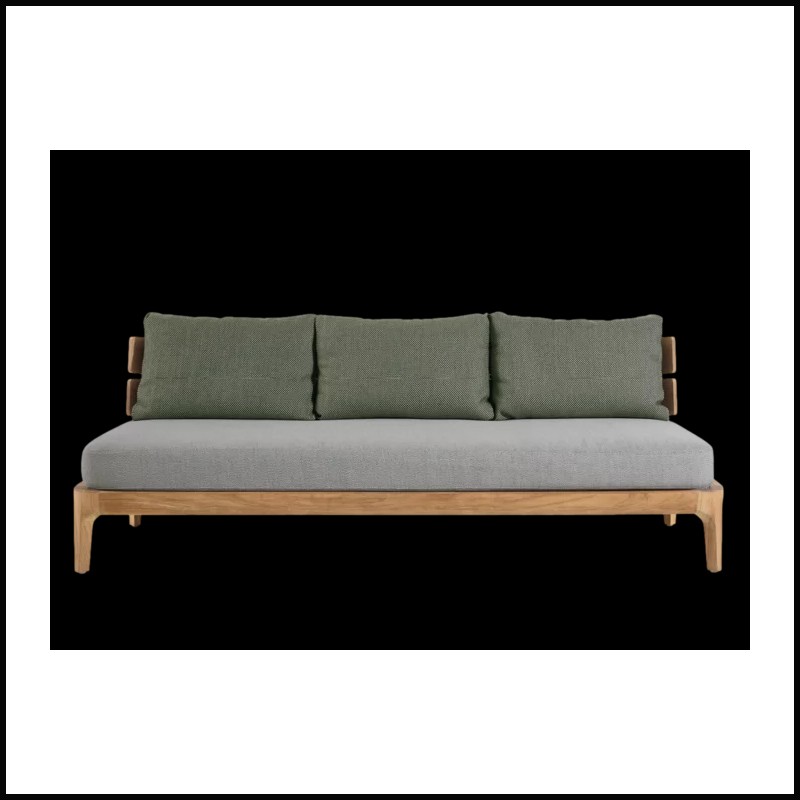 Canapé trois places, structure en teck, coussins déhoussables.