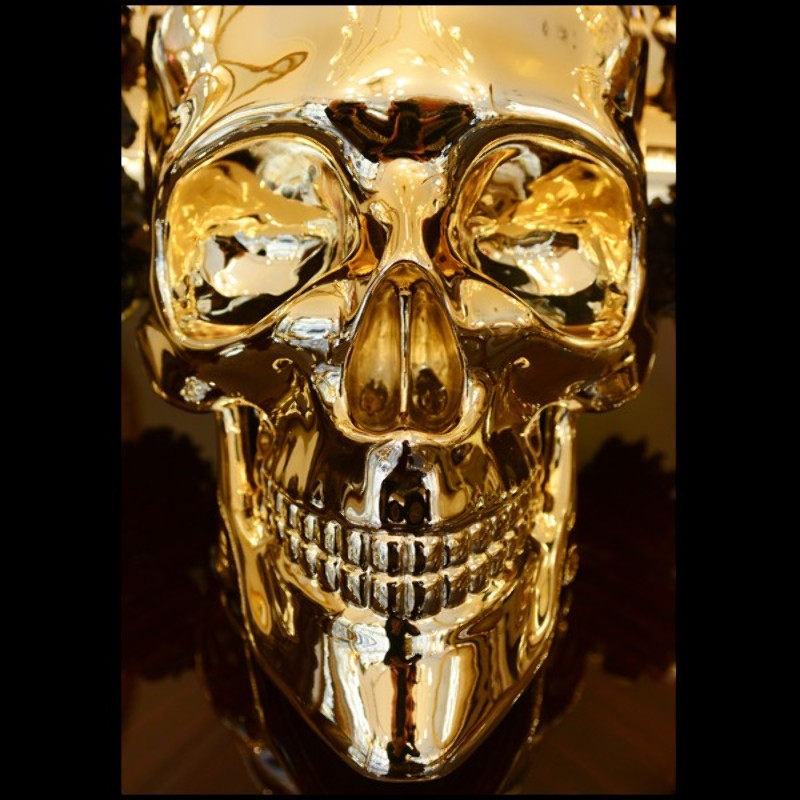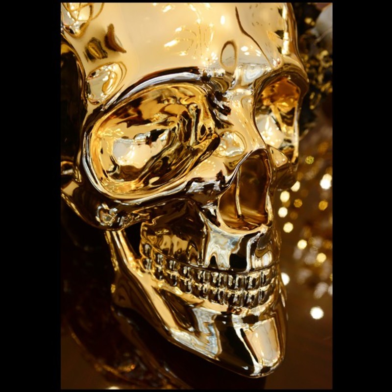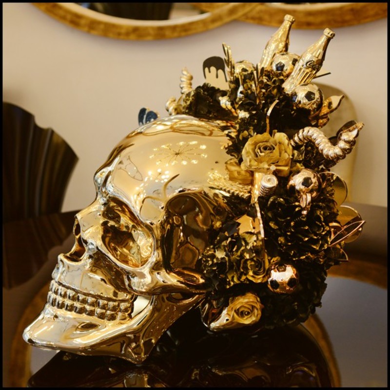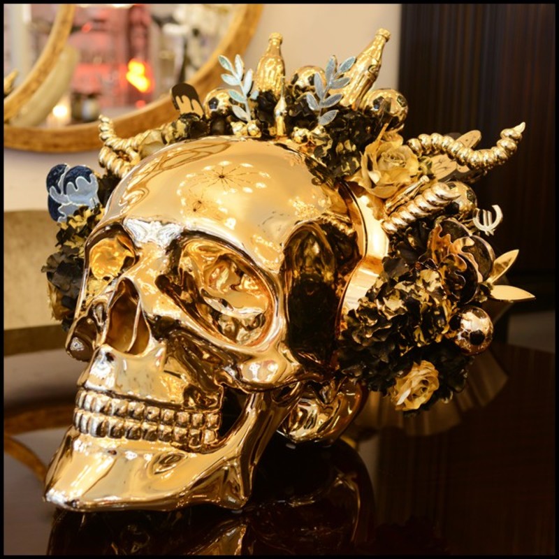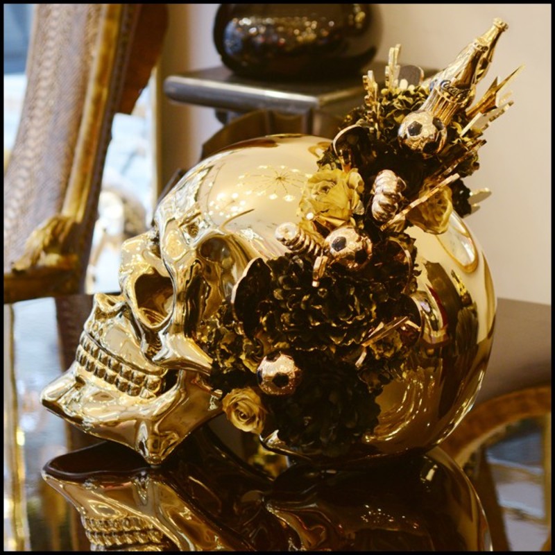 Sculpture Skull Golden Youth crâne réalisé en résine de poussière de marbre et chromée finition Gold.