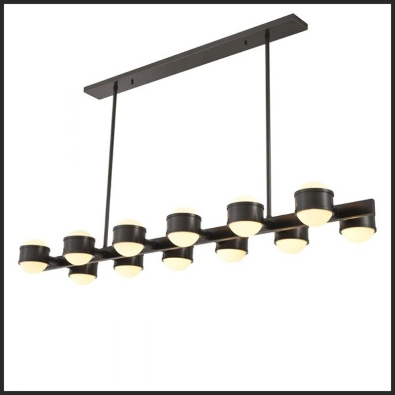 Avec 12 abat-jour en forme de sphère en verre blanc.