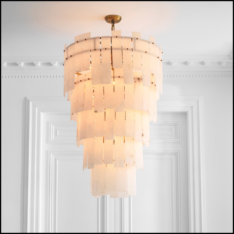 Sa structure en laiton antique se marie à des abat-jour en albâtre, diffusant une