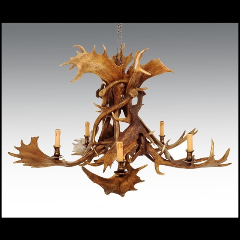 Chandelier avec 5 bois de Renne finition laiton vintage et 5 abats-jours en plumes de perdrix 141-Five Reindeer Master