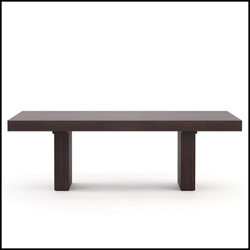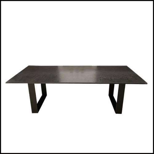 Table avec top en grands dimensions en verre extra clair. Piètement central composé de plusieurs