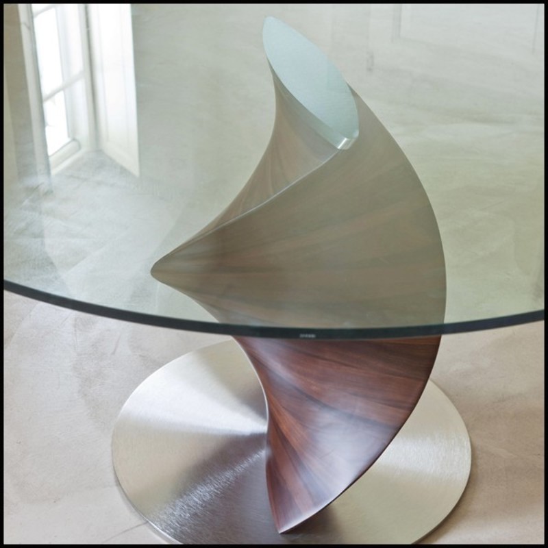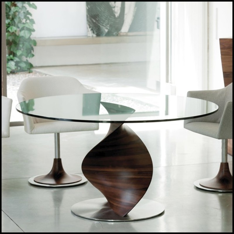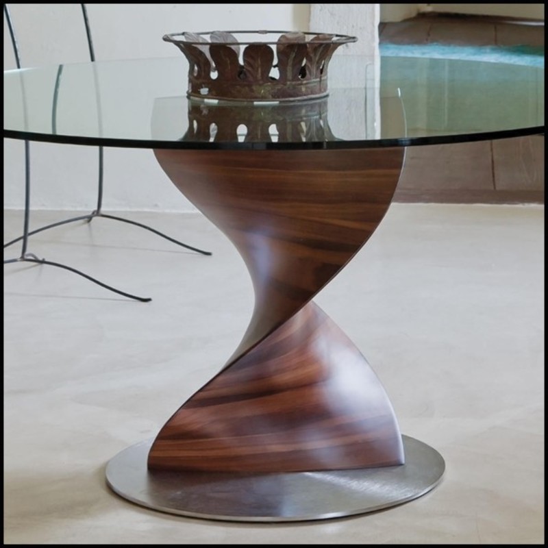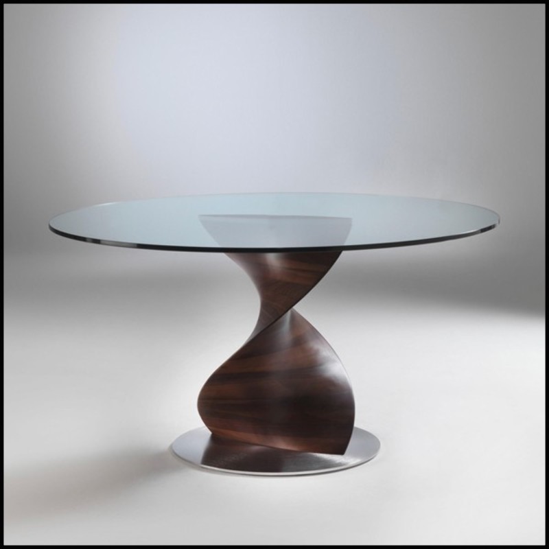 Table à manger Round ADN avec base sculptée à la main en bois de noyer massif poli.