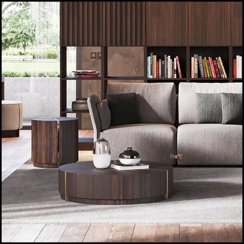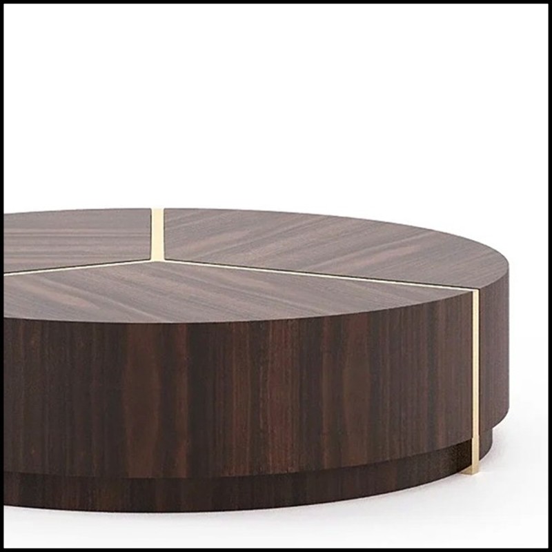 Table basse Sega présente une structure en bois plaqué d'eucalyptus smocké, finition mate,